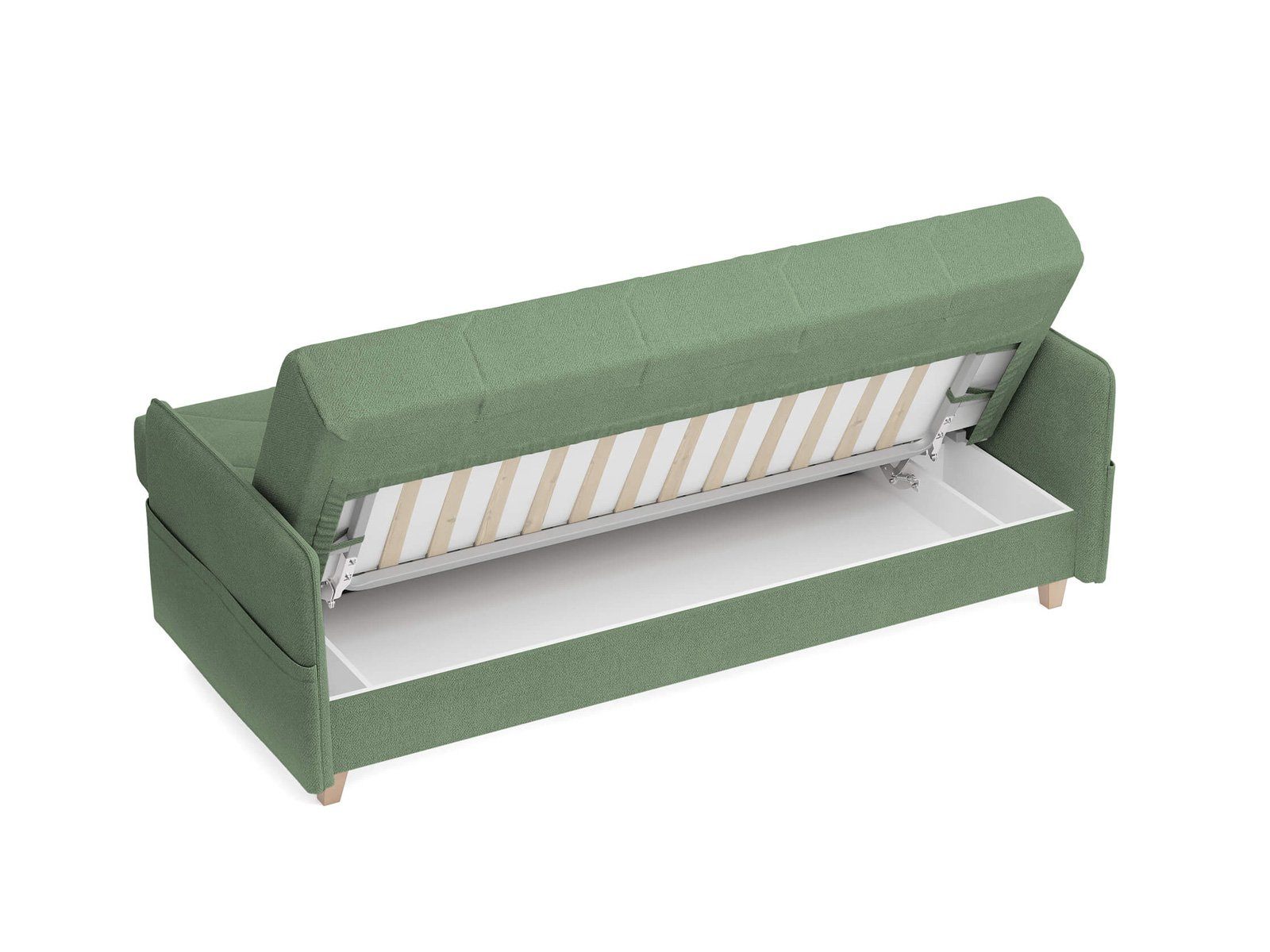 Диван для сна в скандинавском стиле с механизмом трансформации «клик-кляк» и коробом для хранения. Основание дивана металлическое, с ламелями. Матрас анатомический с независимым пружинным блоком. Благодаря съемному чехлу с объемной стежкой в форме ромбов, диван органично впишется в современные интерьеры в скандинавском стиле и стиле минимализм.