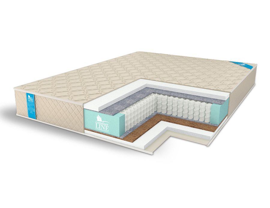 Матрас обтягивается хлопковым жаккардом. Ткань обязательно простёгивается на комфортном слое мягкого холлкона. Высота матраса вместе с чехлом составляет 22 см.