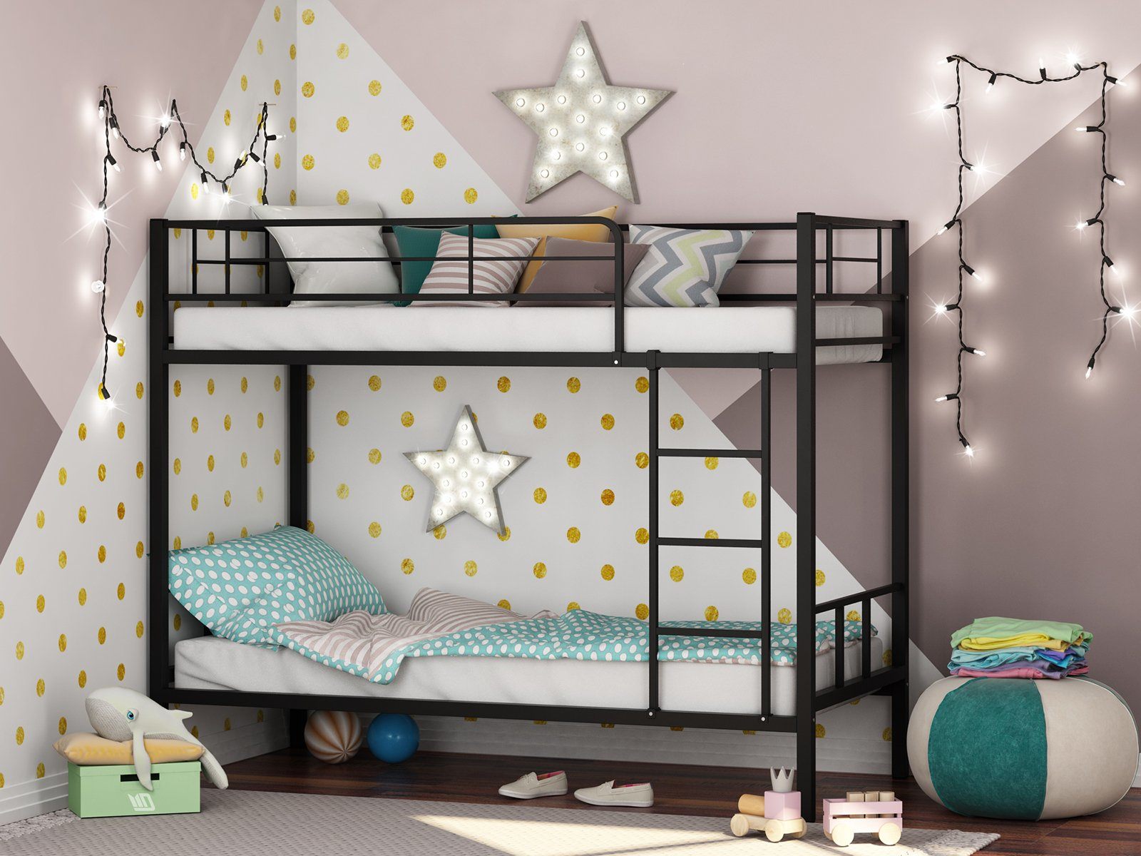 Все металлические элементы кровати покрыты износоустойчивой краской без запаха. Двухъярусную кровать можно собирать и разбирать неограниченное количество раз, и от этого она не потеряет в прочности и качестве.