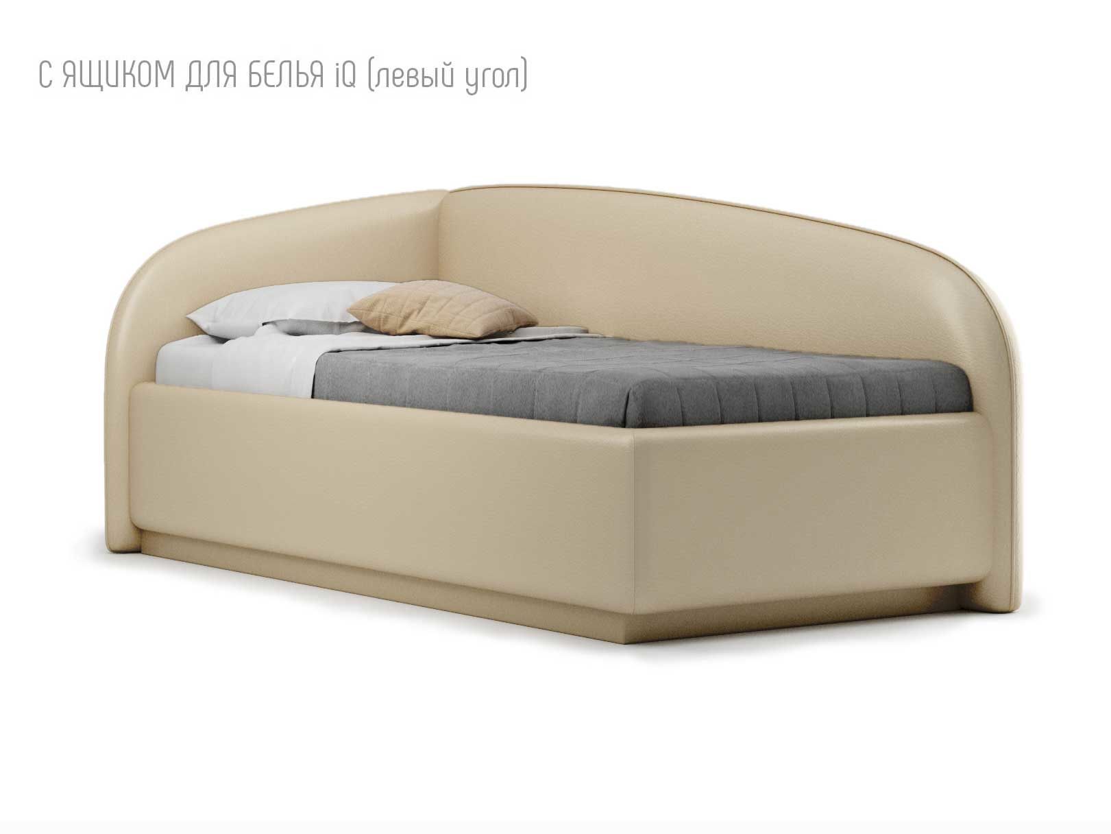 Кровать укомплектована IQ с подъемным механизмом и ящиком для белья без дна (дополнительная платная опция - дно к ящику IQ из HDF (ХДФ). Каркас кровати на цоколе, декоративный чехол на цоколе съёмный. Глубина ящика для белья - 30 см, без ограничения нагрузки на ящик.