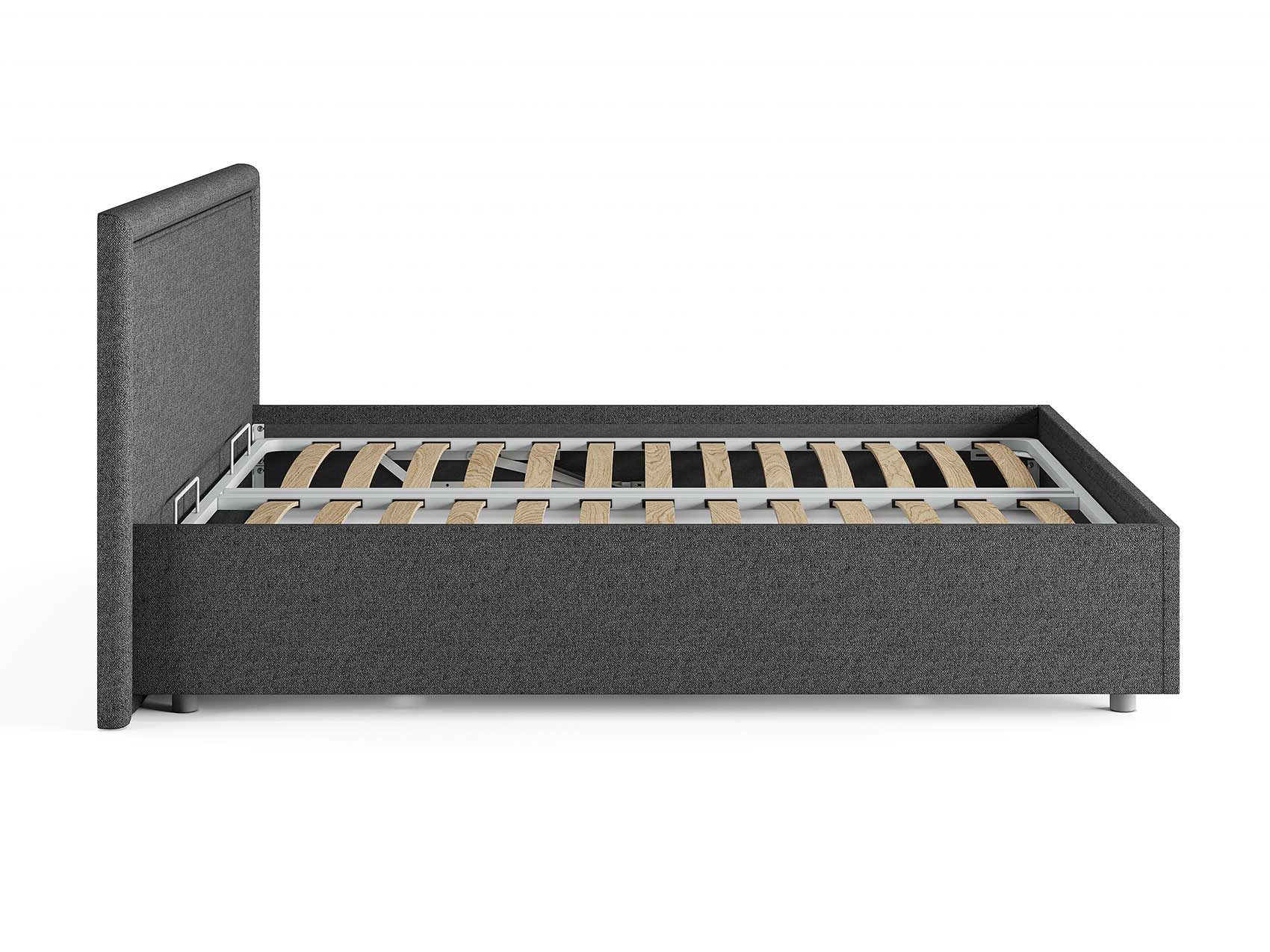 Кровать комплектуется металлическим основанием (без опор), которое имеет 13 рядов встроенных березовых ламелий на каждое спальное место, обеспечивая равномерное распределение нагрузки.