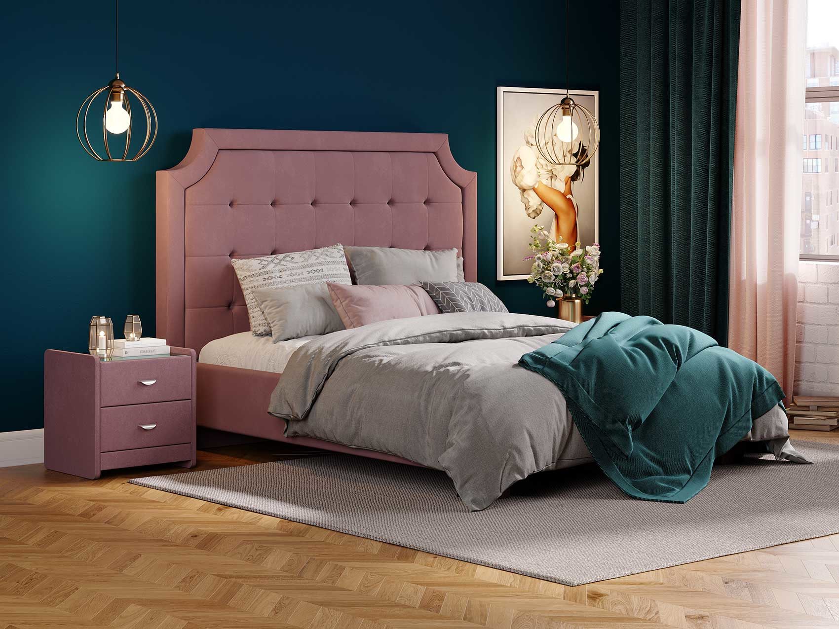 Кровать прекрасно впишется в интерьер от классики до современного стиля и cтанет отличным решением для просторной светлой спальни. Высокая спинка с мягкими утяжками и массивной рамкой выглядит эффектно. Задняя часть спинки кровати выполнена в основной ткани, благодаря этому ее можно установить в центре комнаты. Увеличенная прочность кровати достигается за счет металлического каркаса по периметру. Массивные ножки, выполнены из бука цвета венге. Расстояние от пола до царг способствует легкой уборке под кроватью, в том числе роботом – пылесосом. При желании возможно установить подъемный механизм с бельевым коробом либо трансформируемое основание Aquarius.