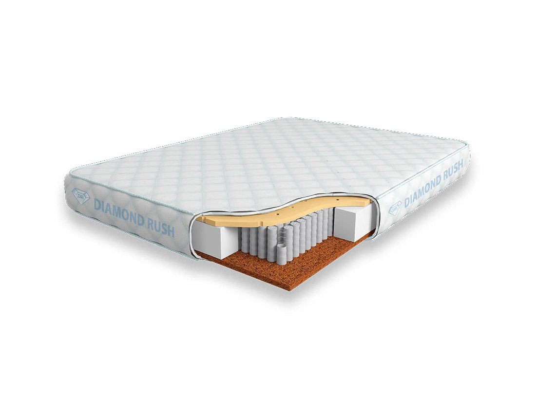 Матрас Diamond Rush Cocos-2 Contrast 1440DR имеет в своей основе независимый пружинный блок 1440, состоящий из пружин диаметром 3-4 см. Это разносторонний матрас с контрастными по жесткости материалами. В этой модели используются натуральный латекс с перфорацией и латексированная кокосовая койра.