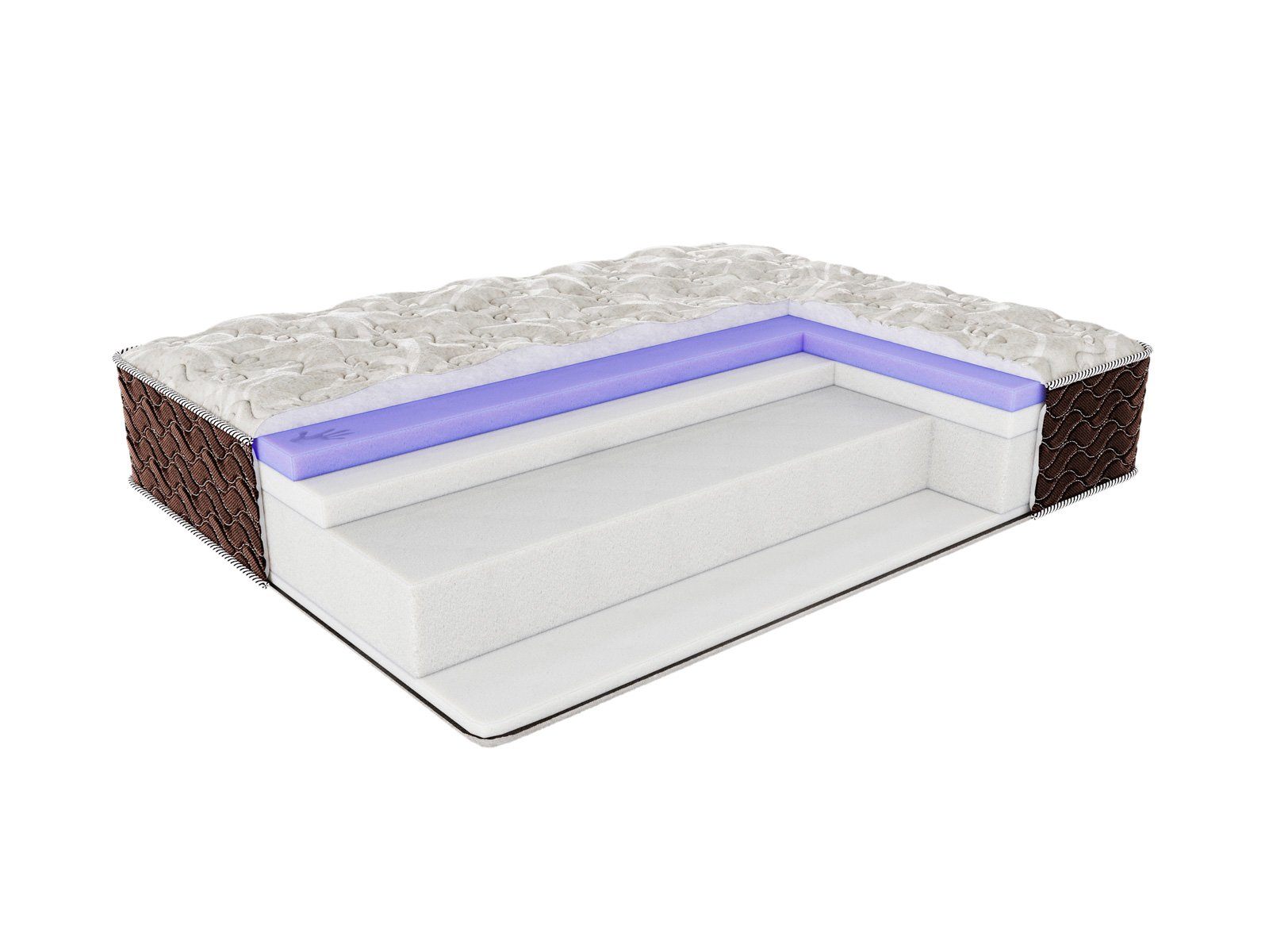 Чехол: несъёмный, из плотной трикотажной ткани с содержанием льна, простёган на искусственном волокне Холлкон (200 гр) и 0,8 см пены - пышность и объём. Бурлет матраса выполнен из плотного мебельного жаккарда шоколадного цвета, простёганного на ППУ 1 см — усиление периметра, сохранение геометрии матраса на протяжении всего срока службы.