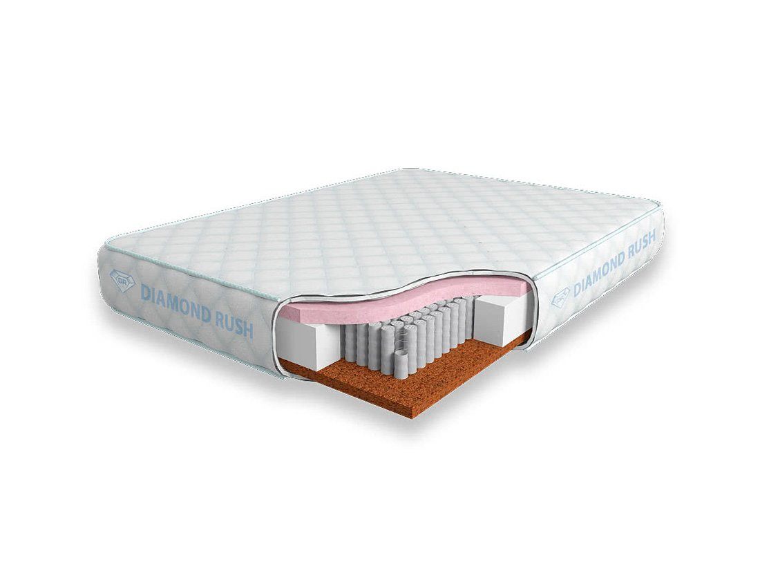 Матрас Diamond Rush Super Contrast 1440DR имеет в своей основе независимый пружинный блок 1440, состоящий из пружин диаметром 3-4 см. В качестве настилочных слоев поверх пружинного блока используются листы латексированной кокосовой койры и вязкоэластичного Меморикса, материала с эффектом памяти. Стороны матраса по жесткости имеют сильный контраст, одна жесткая, другая – мягкая, как взбитая перина.