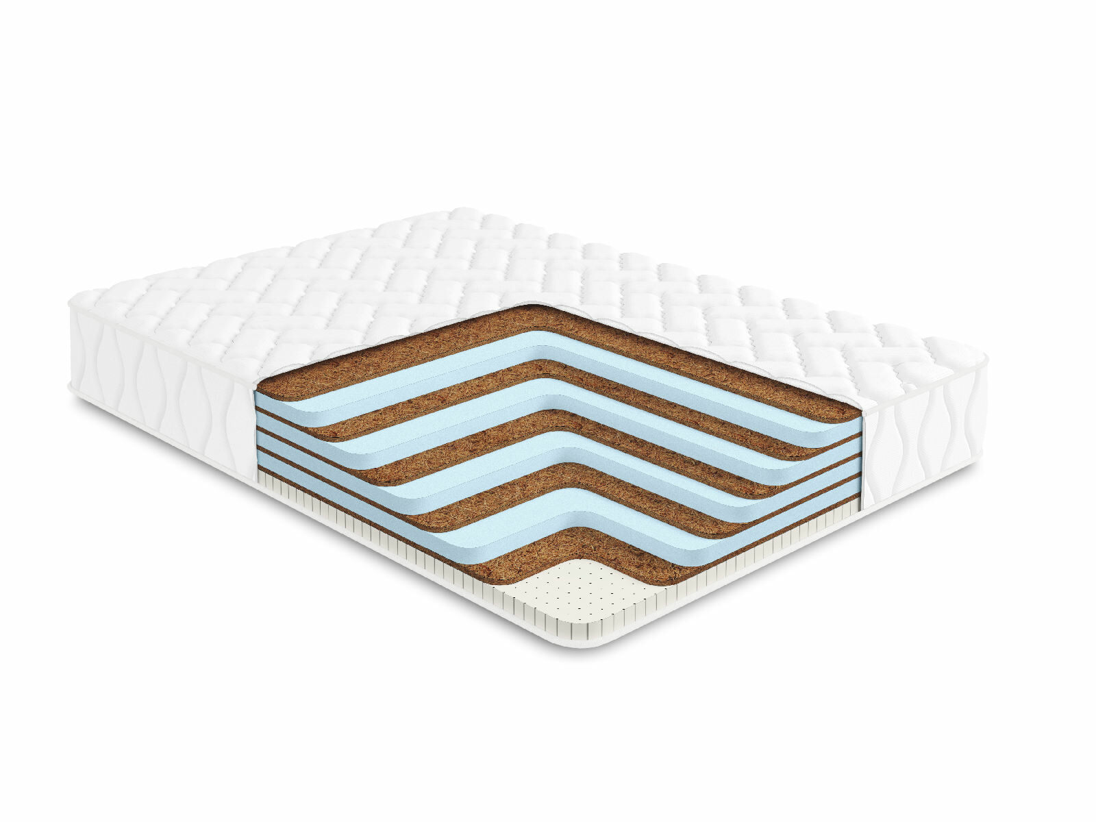 Сразу у поверхностей расположились кокосовая койра с одной стороны и натуральный перфорированный латекс с другой. Такая структура даёт матрасу различную твёрдость – среднюю и умеренно-жёсткую.