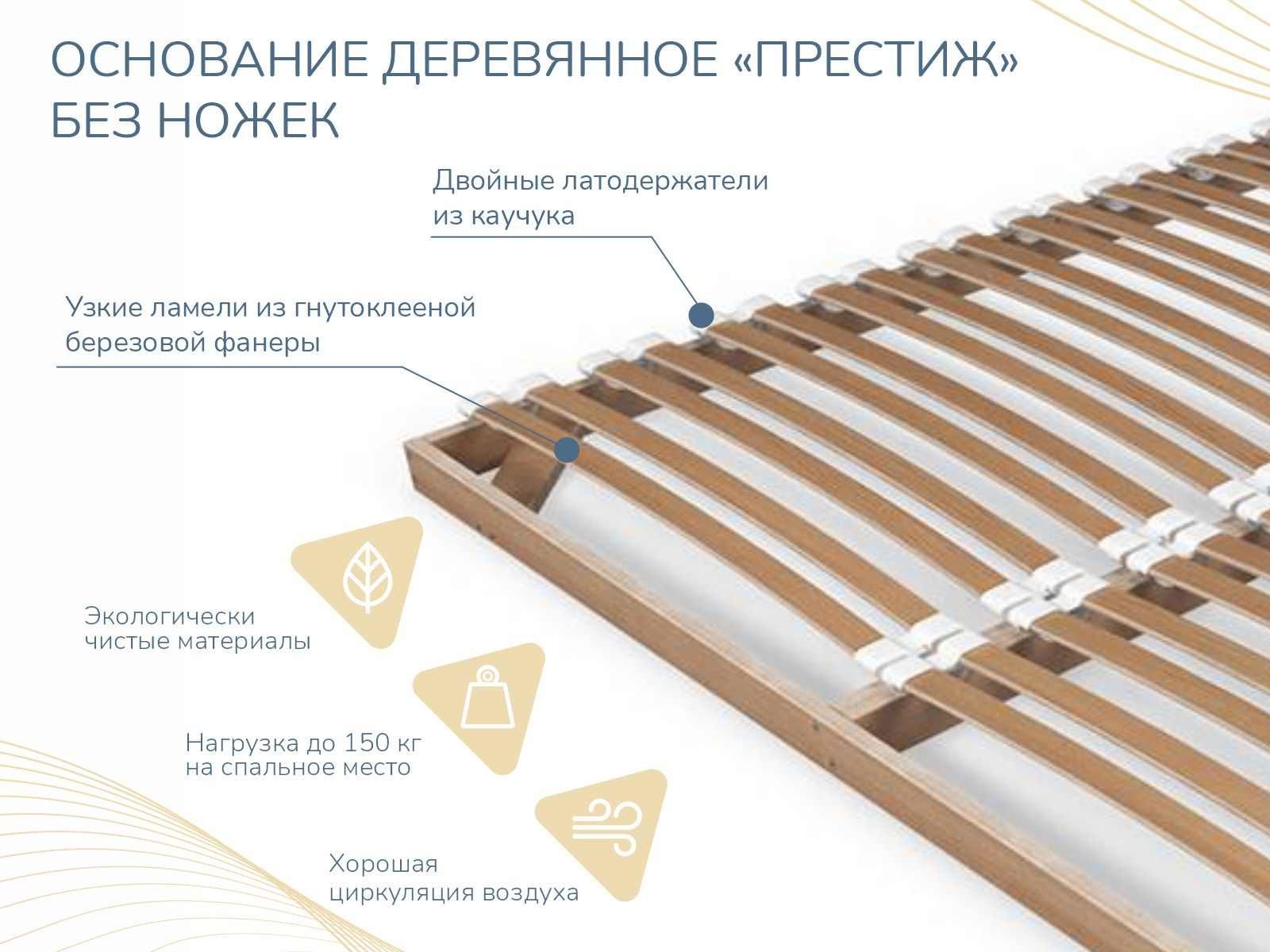 Основание для матраса - клееная фанера из березы сечением 50х25мм. Идеально подходит для матрасов на независимом пружинном блоке, так как благодаря небольшому (около 3 см) расстоянию между латофлексами, не допускается проседание пружин в блоке.