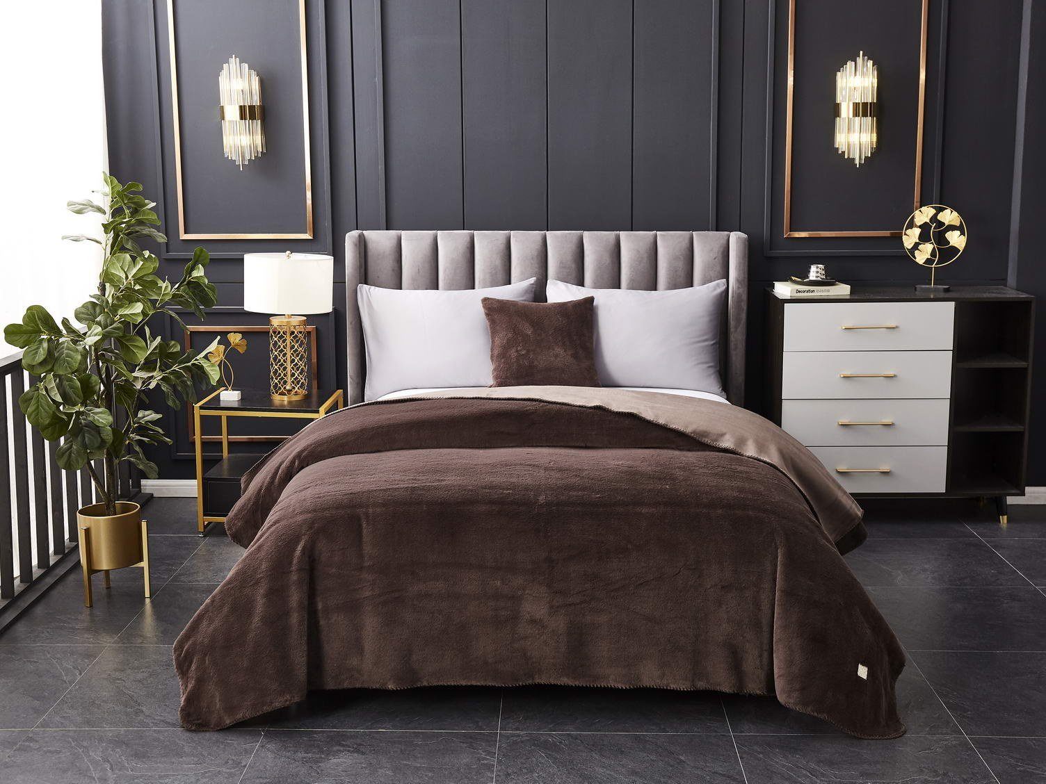 Мягким пледом можно укрываться, используя его как одеяло. Подушки в наволочках, подобранные в тон, дополнят интерьер.