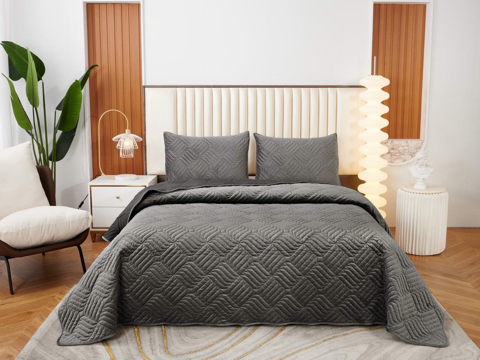 Покрывала выполнены в 10 оттенках: крем, мокко, пепельный, песочный, светло-бежевый, светло-серый, серый, темно-серый, чайная роза и черный. Стежка в виде геометрического орнамента подойдет к любому современному интерьеру. Из-за особого плетения, велюровая ткань покрывала отражает свет и красиво переливается при различном освещении.